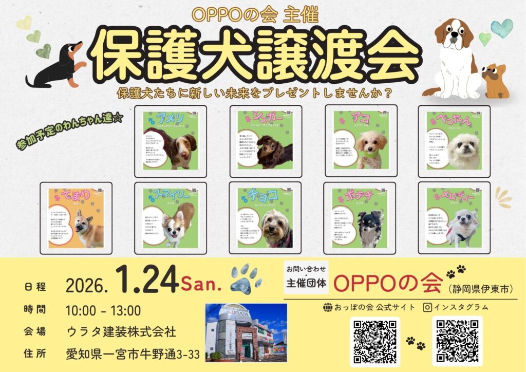 一宮市ウラタ建装で保護犬の譲渡会開催‼1月24日(土)
