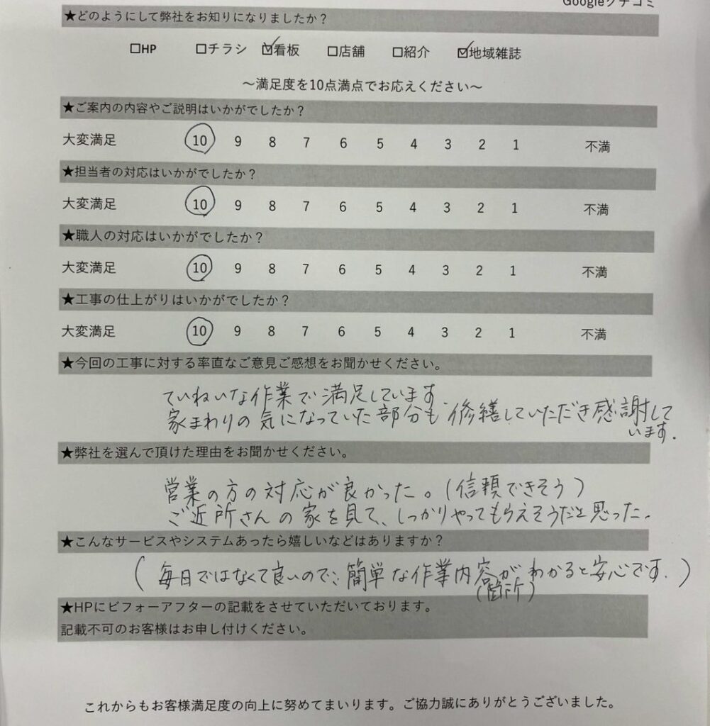 施工完了後、お客様にアンケートにお答えいただきました✨